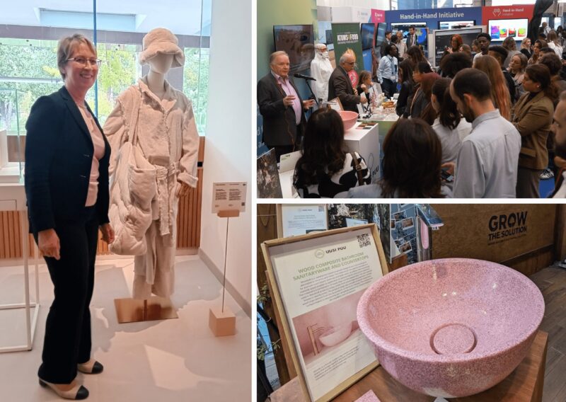 Finnish expertise is showcased in the FAO exhibition with the Kuura dress, made from renewable wood fiber and the Woodio bathroom sink made from wood chips. The products are examples of how wood-based innovations are transforming everyday materials into more sustainable ones.